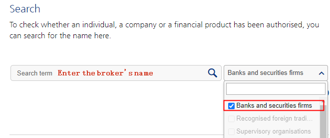 2.在“Category(类目)”-“Banks and securities firms(银行与证券公司)”中搜索交易商名称。