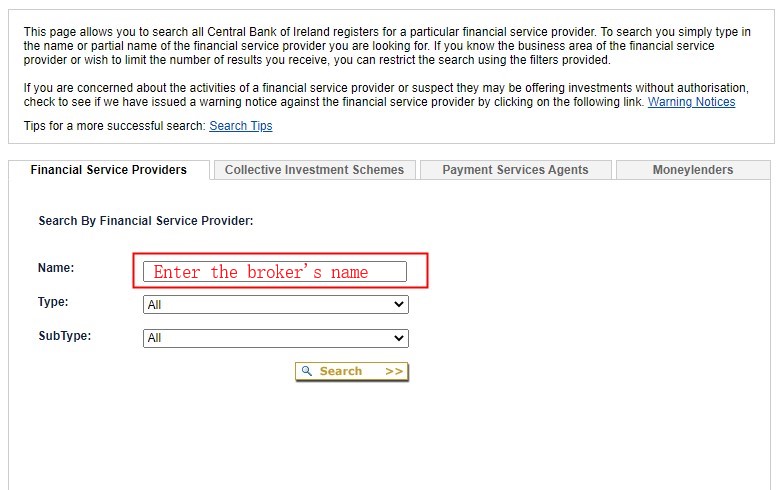 1) 在搜索栏中输入名称 http://registers.centralbank.ie/FirmSearchPage.aspx;