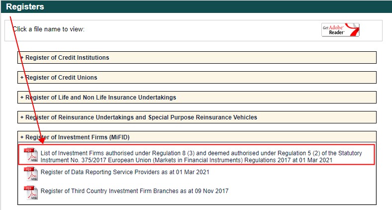 2) 在 http://registers.centralbank.ie/DownloadsPage.aspx 的投资公司名单中搜索交易商名称;