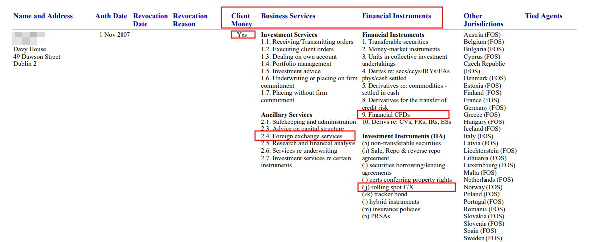 3. 接下来您就能得到该交易商在CBI的信息了。您需要查看 “Client Money(客户资金)”、“Business Services(商业范围)”和“Financial Instruments(金融工具)”这三项。检查该交易商是否可以持有“Client Money(客户资金)”并提供“9. Financial CFDs (9. 金融差价合约)”、“(jj) rolling spot F/X((jj)现货外汇产品)”和“2.4. Foreign exchange services(外汇服务)”。