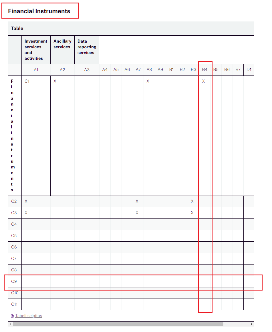3. 接下来您就能得到该交易商在爱沙尼亚FSA中的资料了。此时您应查看“Licenses(牌照)”或“Financial Instruments(金融工具)”,检查交易商是否有权提供“C9 Financial contracts for differences(C9金融差价合约)”或“B4 Foreign exchange services where these are connected to the provision of investment services(B4与提供投资服务有关的外汇交易服务)”。 若交易商公司是EEA授权公司,则需要您在其所属国的监管机构进行进一步检查。