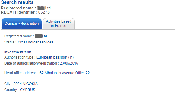 p> 一般来说,AMF网站的公司注册界面中,可以找到受其监管的交易商资料。请尝试搜索并检查资料中的信息是否与交易商网站上的信息一致。 具体步骤如下: 1.在交易商网站上找到交易名; 2.在https://www.regafi.fr/spip.php?rubrique3 搜索交易名; 3.得到交易商在AMF网站上的资料时,点击“Activities based in France(位于法国的活动)”,检查交易商是否得到授权以提供“C9 - Financial contracts for differences(金融差价合约)”或“B4 - Foreign exchange services where these are connected to the provision of investment services(与投资相关的外汇服务)” 4.完成上述步骤后,不要忘记检查最重要的信息——检查交易商的细节信息是否与DFSA公布的资料一致,尤其是网址和电子邮箱地址等信息。如果不一致,请远离该交易商,因为它很可能是一家未经授权的公司,您的资金很可能受损。 如果交易商是EEA授权公司,则需要您在其所属国的监管机构网站进行进一步查询。