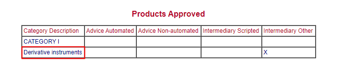 3.您将在 FSCA 网站上获得交易商的内容。这时候你会点击'Products Approved'并查看券商是否有权限提供'衍生品投资';