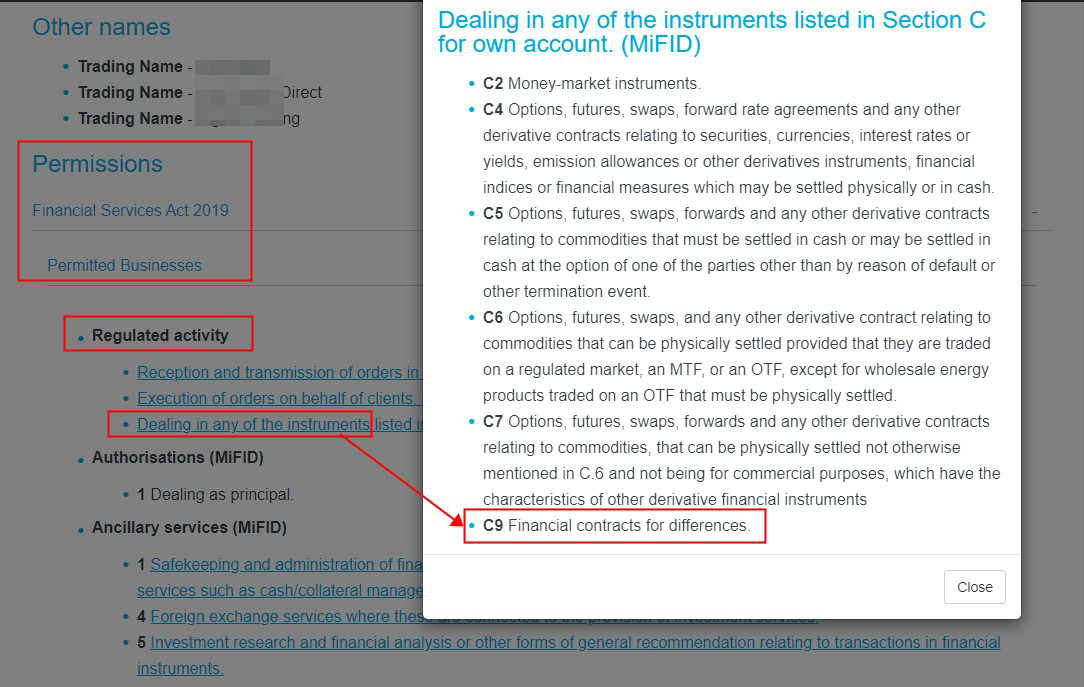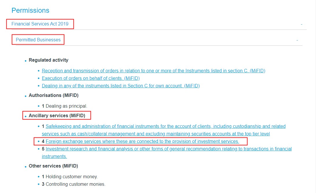 3. 和您将在直布罗陀 FSC 网站上获得交易商的内容。此时您将打开 '2019 年金融服务法'并检查交易商是否有权提供'C9金融差价合约'在'受监管的活动'或 '4 与提供投资服务相关的外汇服务'在 '辅助服务 (MiFID)';