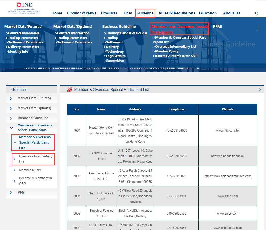 1.进入INE' s官网http://www.ine.cn/en/,点击进入“会员及海外特别参与者”来自“指南”在主菜单上;