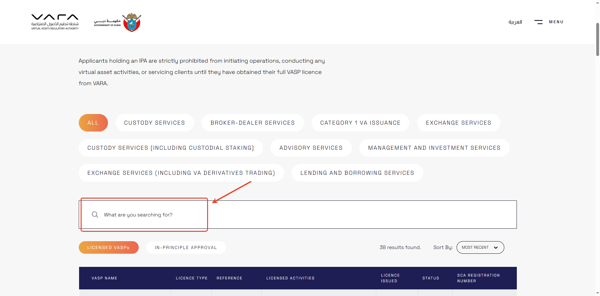 2. 进入VARA官方公共注册系统:https://www.vara.ae/en/licenses-and-register/public-register/ 在搜索栏精确输入公司法定名称,初始搜索结果将显示该公司的关键信息。