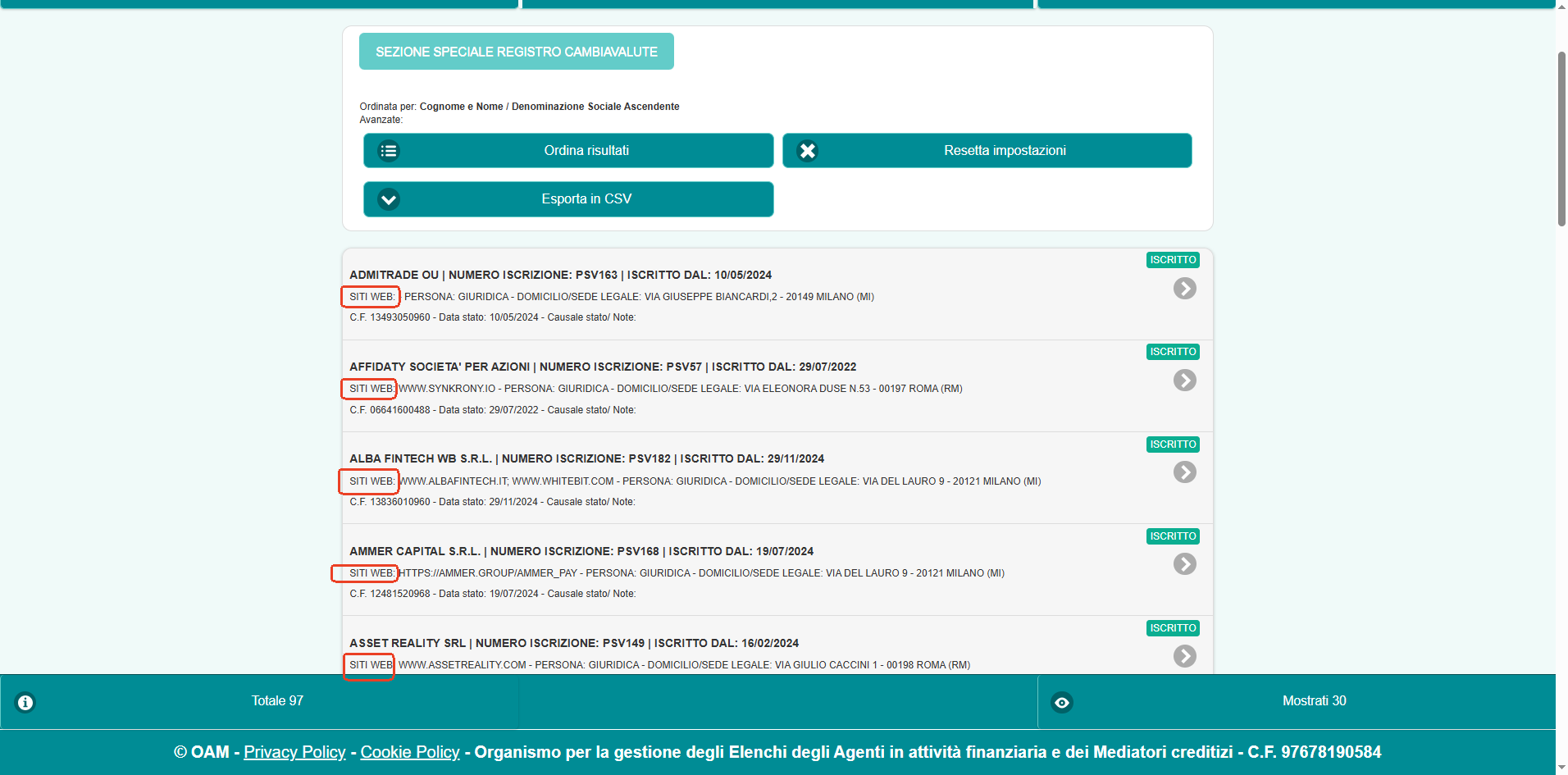 一般来说,OAM注册的VASP将在OAM VASP注册处找到。 尝试找到它,并检查它是否与经纪人网站上的信息相匹配。 详细步骤如下: 1. 找到VASP的实体名称,您可以从其网站获得; 2. 搜索实体名称:https://www.organismo-am.it/elenchi-registri/operatori_valute_virtuali/index.html
